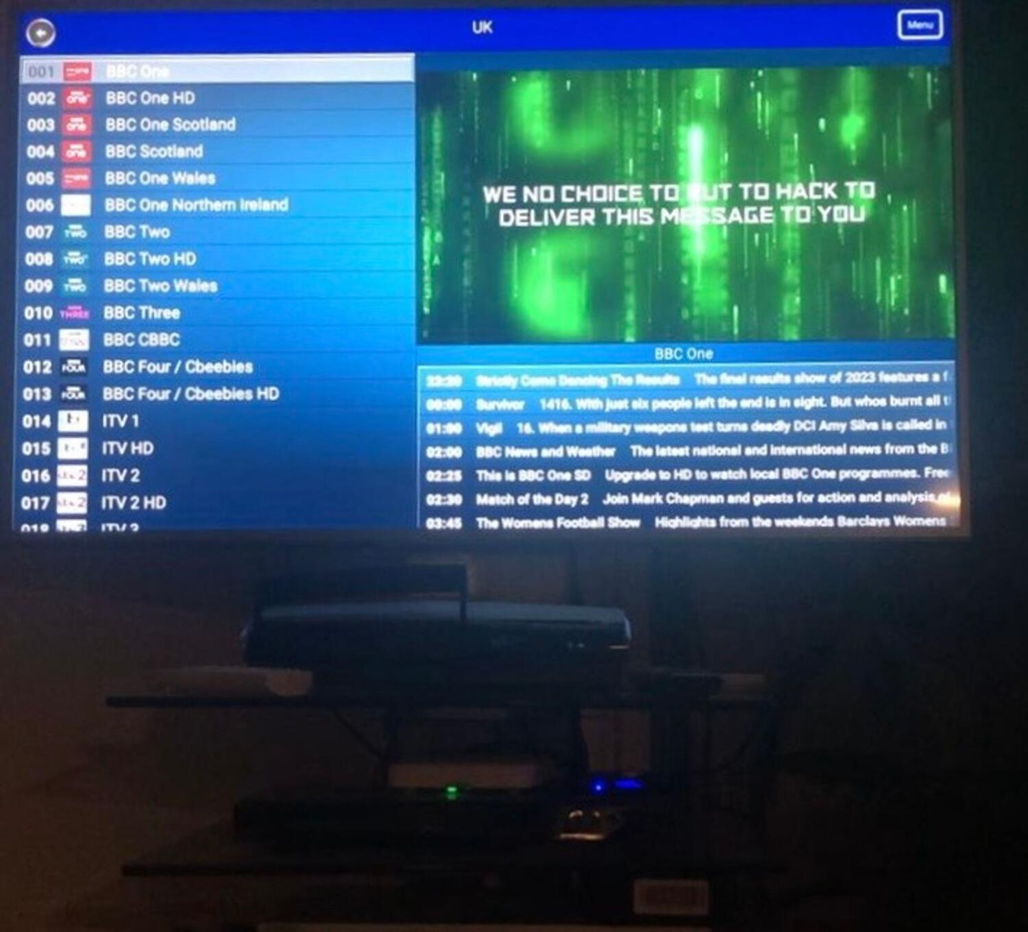 According to the Khaleej Times, the attack affected “European live channels” streaming on the HK1 RBOX, an Android-based set-top box. Emiratis watching the BBC, quiz shows, and more around 10:30 p.m. local time were jolted by sudden graphics and messages decrying the events taking place 1,500 miles northwest.